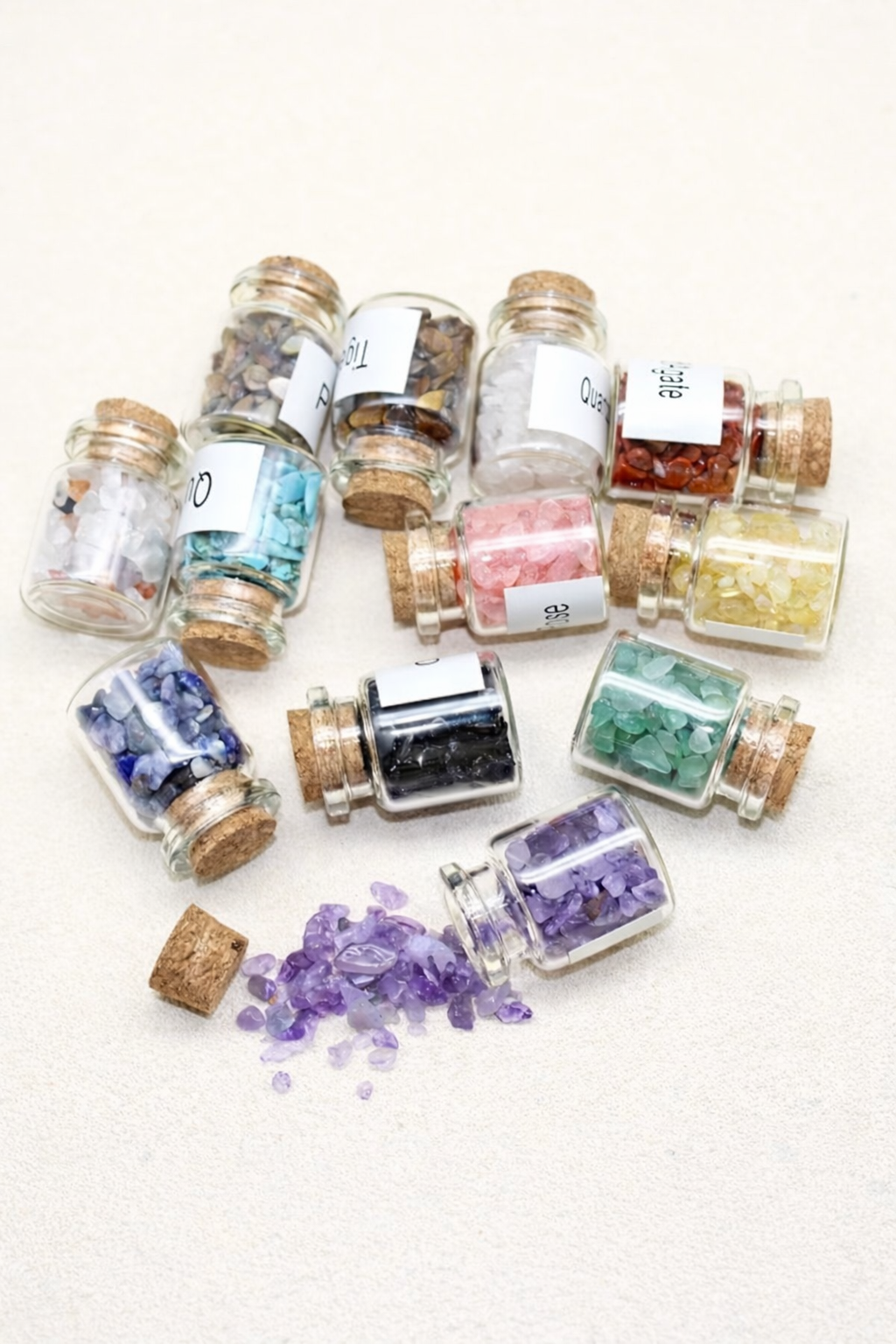 Ez a szett apró, mégis erőteljes hordozója a szándékmunkának. A kis üvegcsékbe zárt kristályok mind külön minőséget képviselnek, együtt pedig egy olyan mágikus eszközt alkotnak, amely finoman, mégis tudatosan támogatja az energetikai munkát.