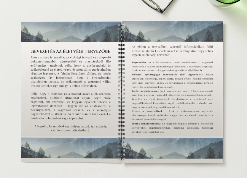 Az életvégi tervező egy átlátható, strukturált eszköz arra, hogy előre rögzítsd mindazt, ami számodra fontos – akkor is, ha egyszer már nem tudnád képviselni a döntéseidet. Segít rendszerezni a dokumentumokat, végiggondolni a pénzügyi, egészségügyi és személyes kérdéseket, valamint egyértelmű útmutatót ad a szeretteidnek.