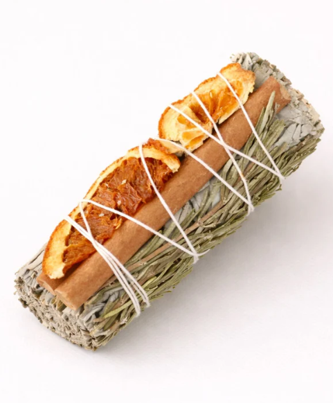 A Napáldás fehér zsályából, fahéjból, aszalt narancsból és rozmaringból készült füstölőköteg a mély tisztítás, a védelem és az aktiváló, meleg energia egyensúlyát hordozza. A fehér zsálya eltávolítja a letapadt, idegen energiákat, a fahéj erősítő és védelmező minőséget ad, míg a narancs napos, derűs jelenléttel tölti fel a teret. A rozmaring stabilizál, lezár és megtartja a tiszta állapotot a rituálé után.